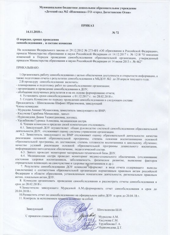 ПРИКАЗ о самообследовании 2020 Документ подписан электронной подписью Серийный номер 603332450510203670830559428146817986133868575799 Заведующий Шихгасанова Шафият Ибрагимовна Дата подписания документа 09.04.2021 11:35:06 (скачать)