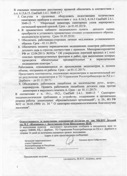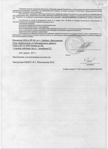 Предписание об устранении выявленных нарушениях Министерством образования РД.docx Документ подписан электронной подписью Серийный номер 603332450510203670830559428146817986133868575799 Заведующий Шихгасанова Шафият Ибрагимовна Дата подписания документа 09.04.2021 11:34:49 (скачать)